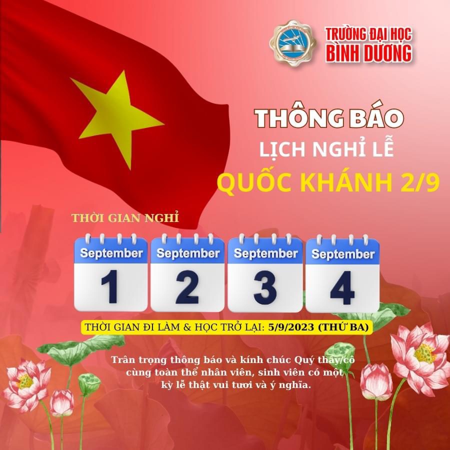Nhân dịp Lễ Quốc Khánh 2/9, Trường Đại học Bình Dương xin trân trọng thông báo tới Quý thầy/cô cùng toàn thể cán bộ, nhân viên và sinh viên trường thời gian nghỉ lễ cụ thể như sau: