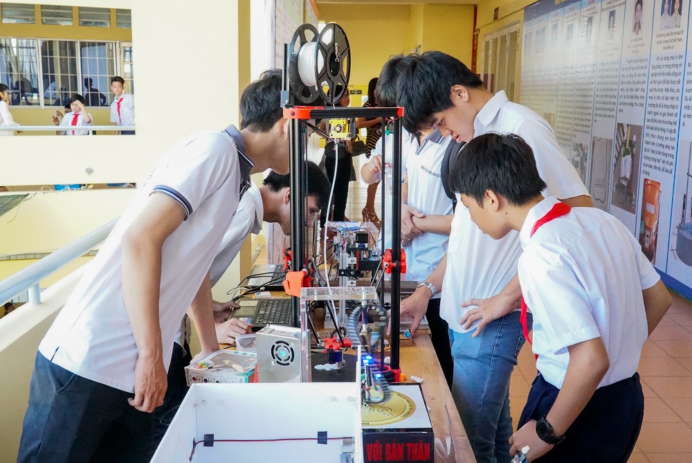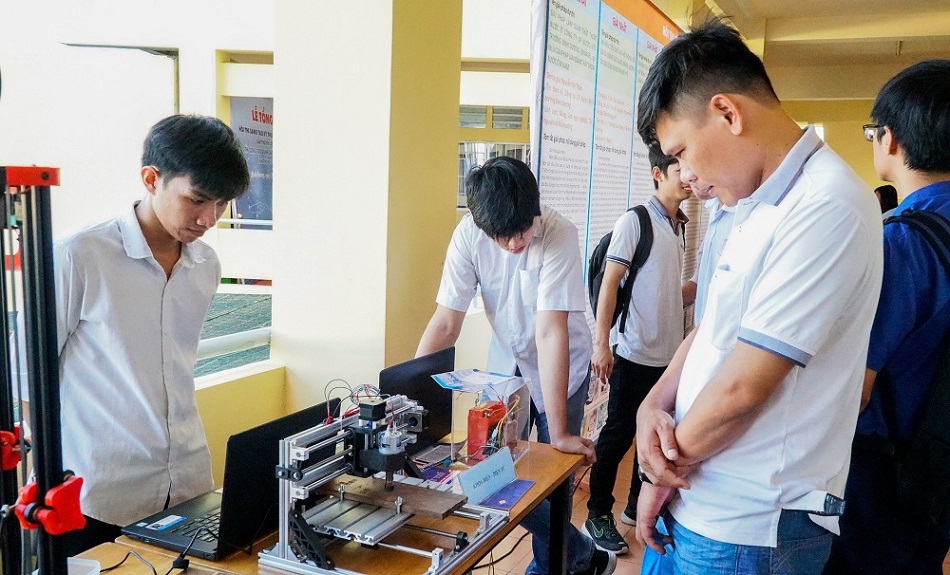 Học sinh các Trường phổ thông trong tỉnh đến tham quan gian hàng trưng bày các sản phẩm của Khoa Công nghệ thông tin, Robot và Trí tuệ nhân tạo tại lễ tổng kết cuộc thi