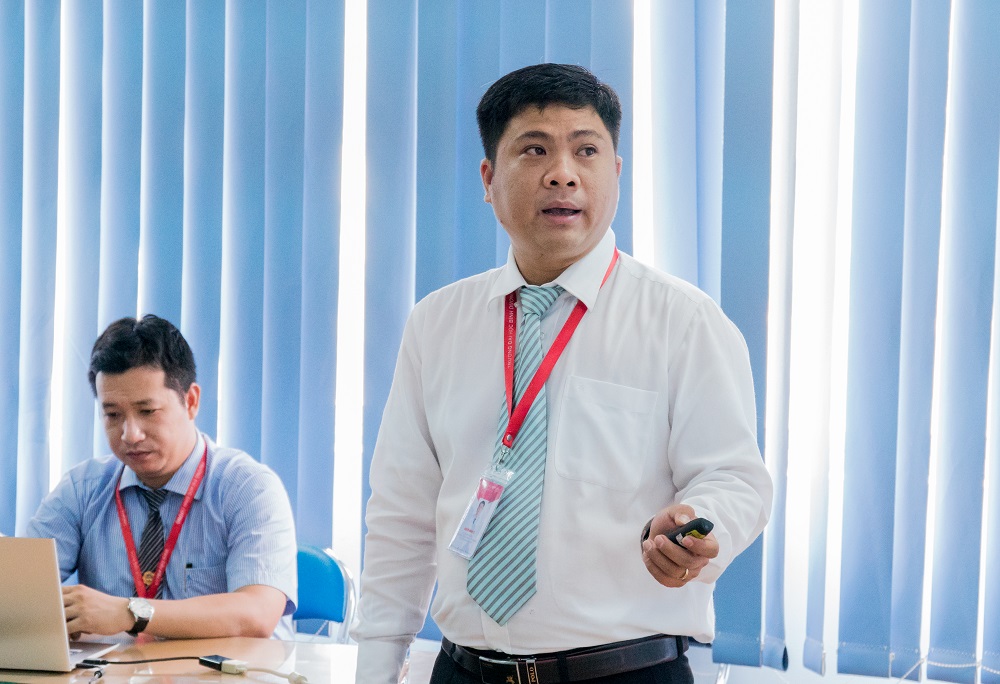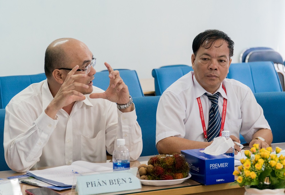 ThS. Phan Đình Huy (bìa trái) đánh giá, góp ý về đề tài của TS. Nguyễn hoàng Sỹ